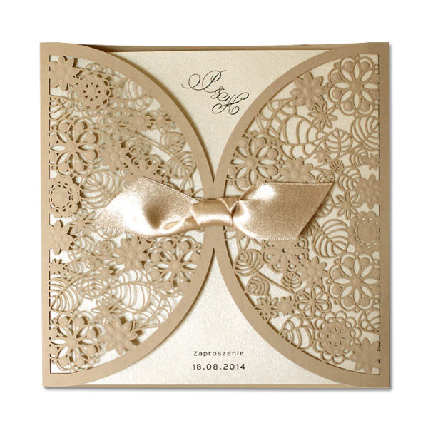 Zaproszenie wykonane z matowego papieru w kolorze beżowym. Okładkę ozdabia oryginalne wycięcie laserowe. Niektóre elementy zaproszenia zostały dodatkowo wytłoczone. Wkładka do nadruku perłowa lodowa. Dodatkową ozdobą jest satynowa wstążka.Zaproszenie wysyłamy w formie gotowej do wręczenia. Zaproszenie wykonane z ogromną starannością i dbałością o detale. Precyzyjny nadruk, dokładność wykonania oraz wysokiej jakości papier.