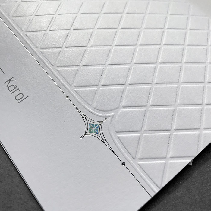 Zaproszenie ślubne wykonane z wysokiej jakości matowego papieru w kolorze białym. Na okładce znajduje się wytłoczona delikatna krateczka oraz subtelny srebrny ornament. Dodatkową ozdobą jest delikatne zdobienie wykonane folią holograficzną, która pod wpływem światła wydobywa świetliste refleksy. W dolnej części okładki miejsce na nadruk imion Młodej Pary. Wkładka do nadruku w kolorze białym. Zaproszenie wysyłamy w formie gotowej do wręczenia. Zaproszenie wykonane z ogromną starannością i dbałością o detale. Precyzyjny nadruk, dokładność wykonania oraz wysokiej jakości papier.