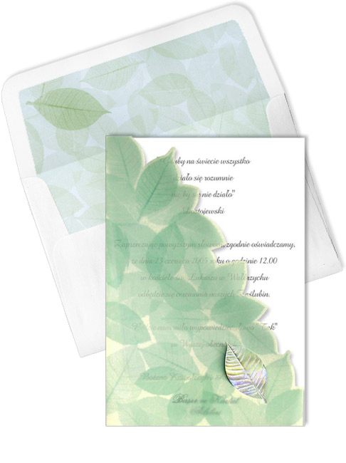 Wkładka do nadruku w kolorze białym. Tekst zaproszenia przykrywa pergaminowy papier z motywem liści w odcieniach zieleni.Dodatkową dekorację stanowi wysrebrzany, mieniący się liść, który spina zaproszenie z okładką.